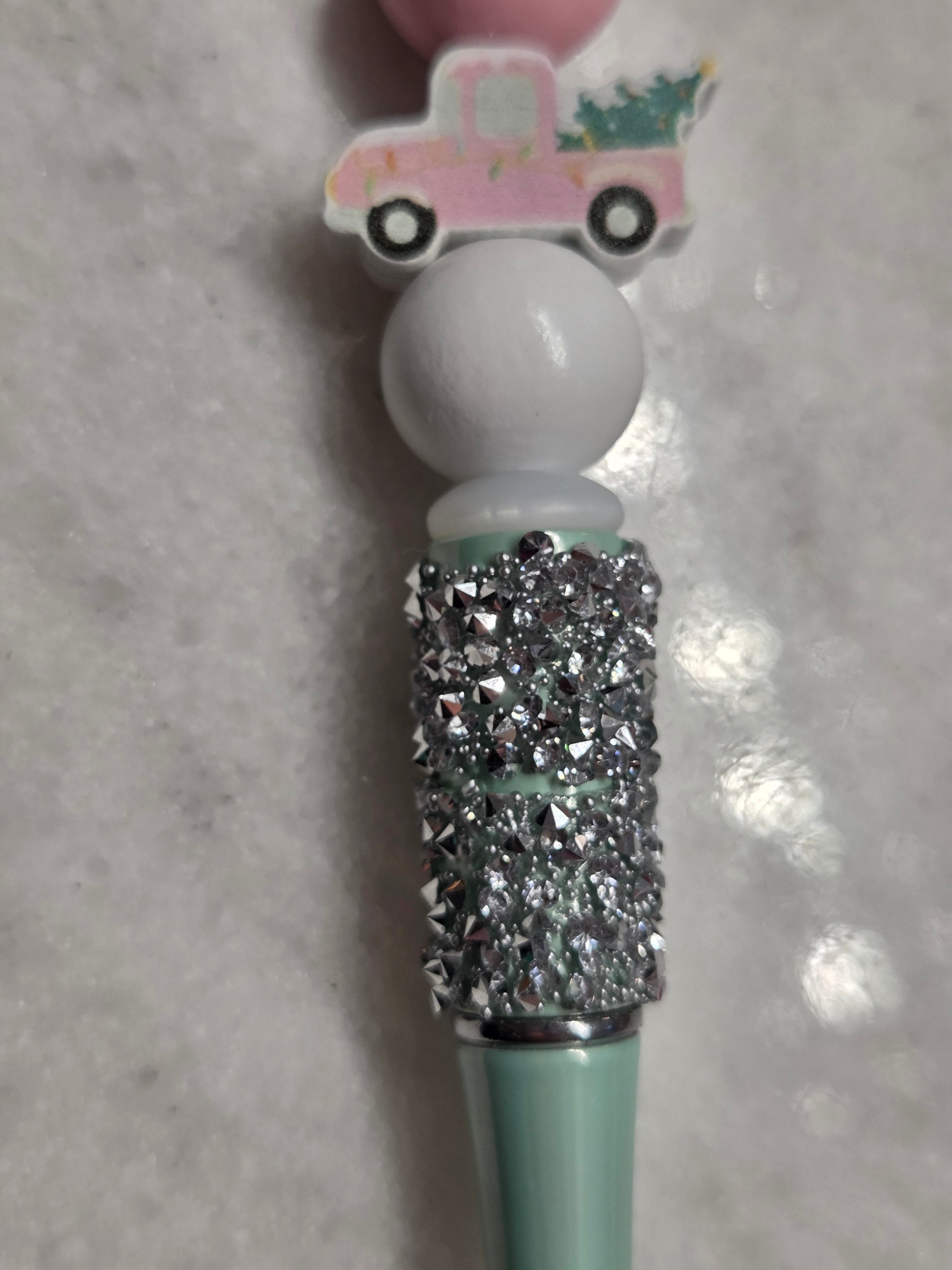 This adorable Mint Green and Pink Ballpoint pen covers all of your Christmas loves - with a Christmas tree truck, pair of candy canes, and a cute pink Snowflake to top it off! All of the beads (besides the spacers) featured on this pen are wooden, giving it a very at-home and festive feeling.