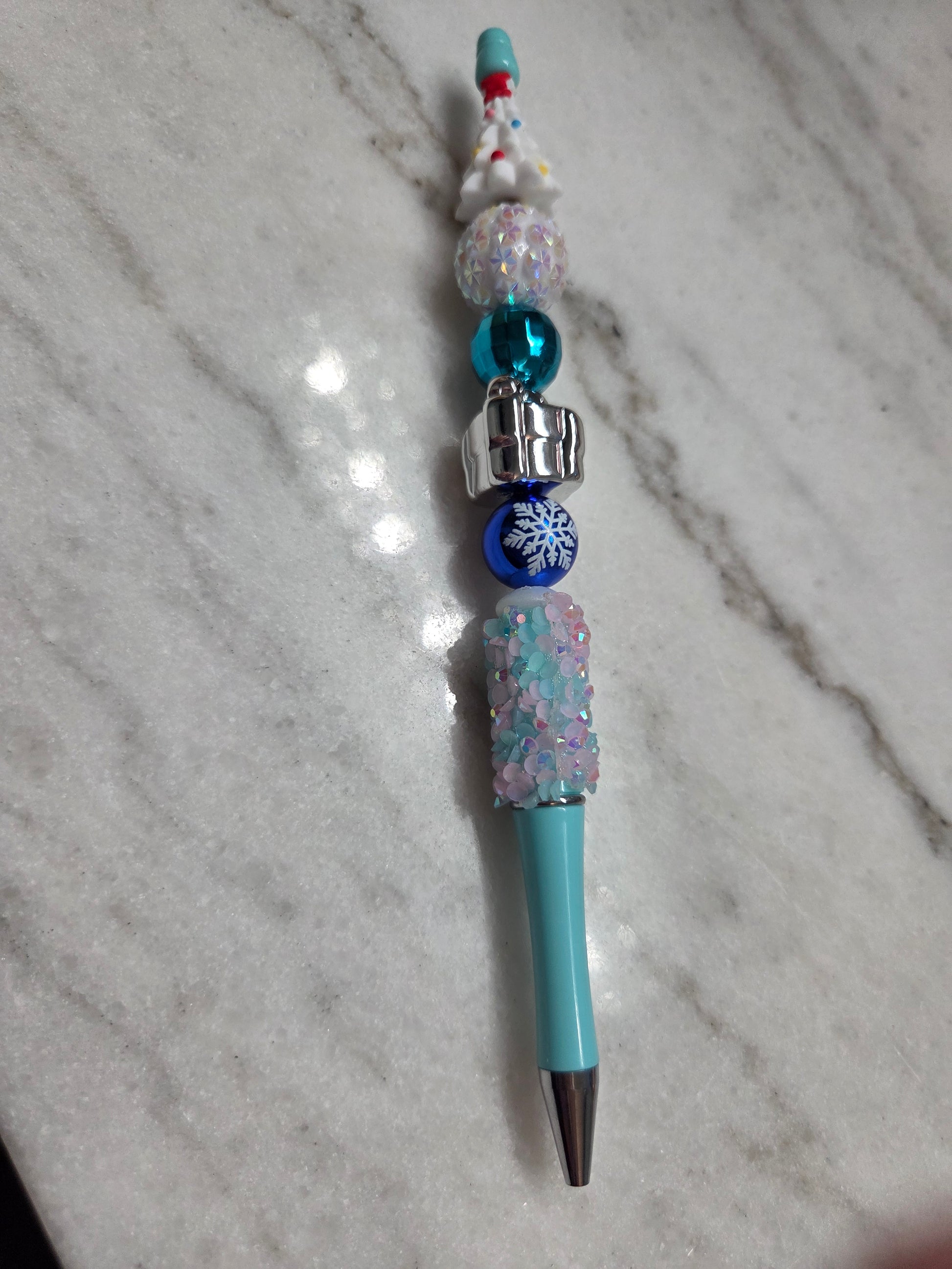 This beautiful pen is for those that love Christmas but also like the untradional colors that are offered around this time of year. It features a white Christmas tree focal along with blue, turquoise, shiny white, and a silver present bead. This Ballpoint pen writes amazingly and I promise you won't want to run out of ink. That's why, upon purchase, an additional ink will be provided.