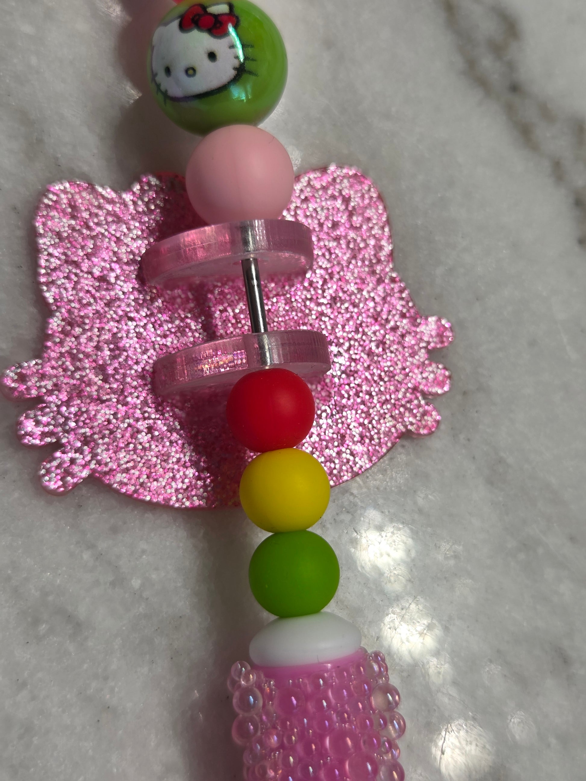 Adorable oversized acrylic focal of Hello Kitty with her cute pink bow! I added some pretty simple beads to this one since the focal is so large and I didn't want to take away from that aspect. Also, this Ballpoint ben has a cute pink bubble wrap around the middle which suits it perfectly!