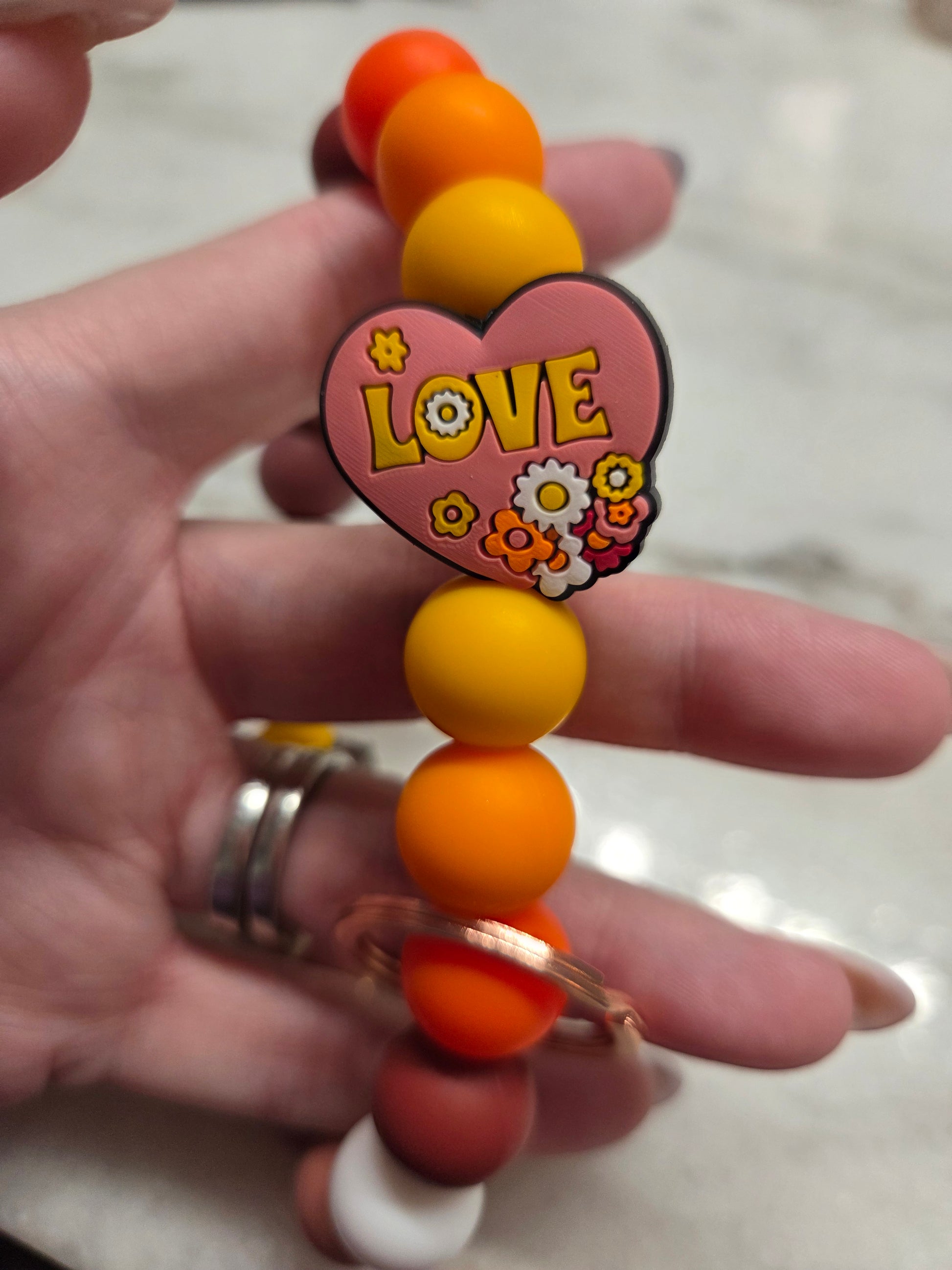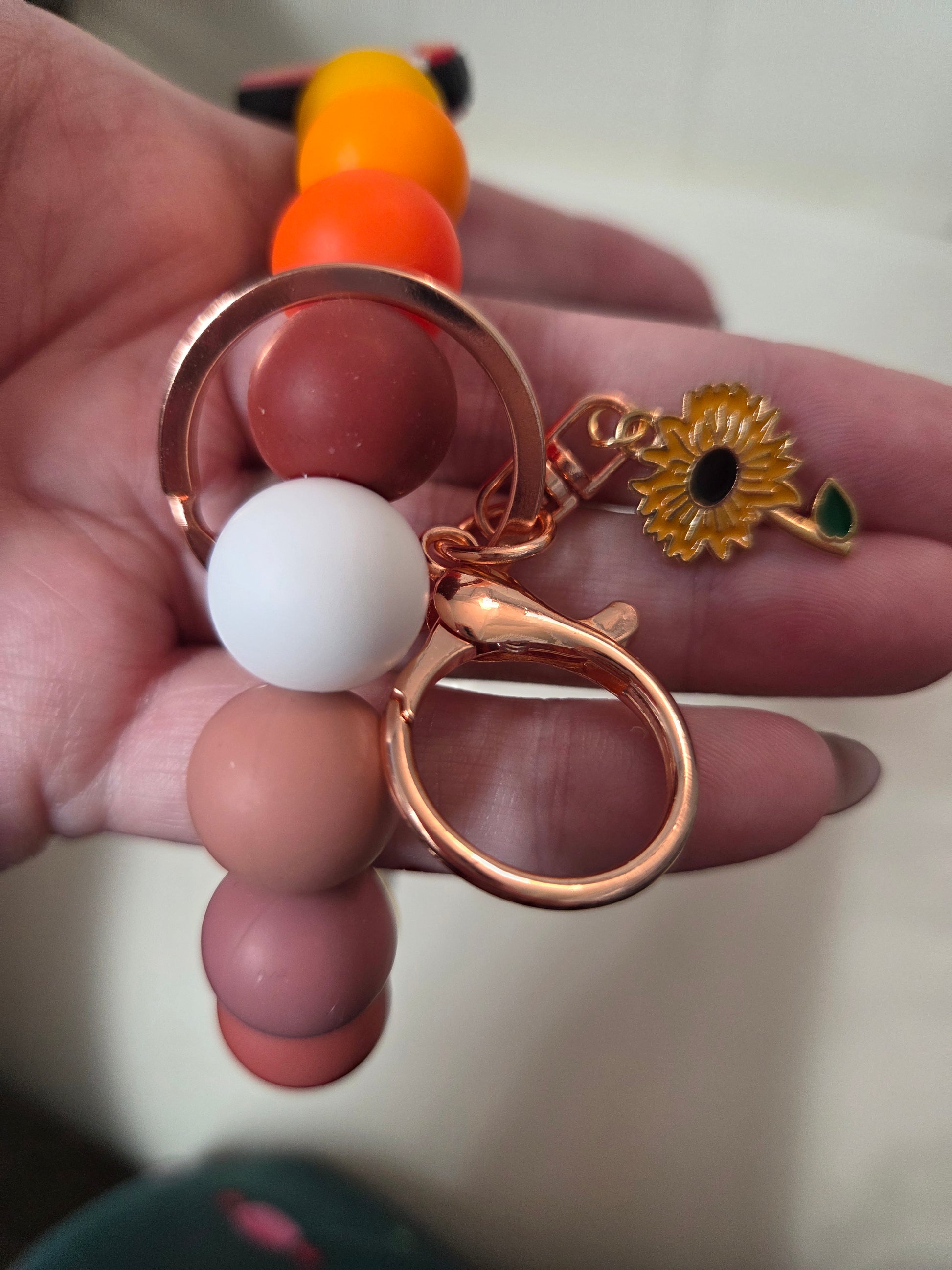 This wristlet is filled with the beautiful colors of Fall- Oranges, Yellows, and Mauvy Browns make this a beautiful statement piece to hang your keys or you car fob on. It has Rose Gold hardware with a little sunflower 🌻 charm on it to add to its cuteness. But the great thing about this wristlet is, even though it has "autumn" coloring to it, the mauve tones make it wearable for all year long! And the cute little "Love" focal really brings it together! I hope someone will cherish this piece as much as I do! It was so fun to make! Only one (1) available!Â