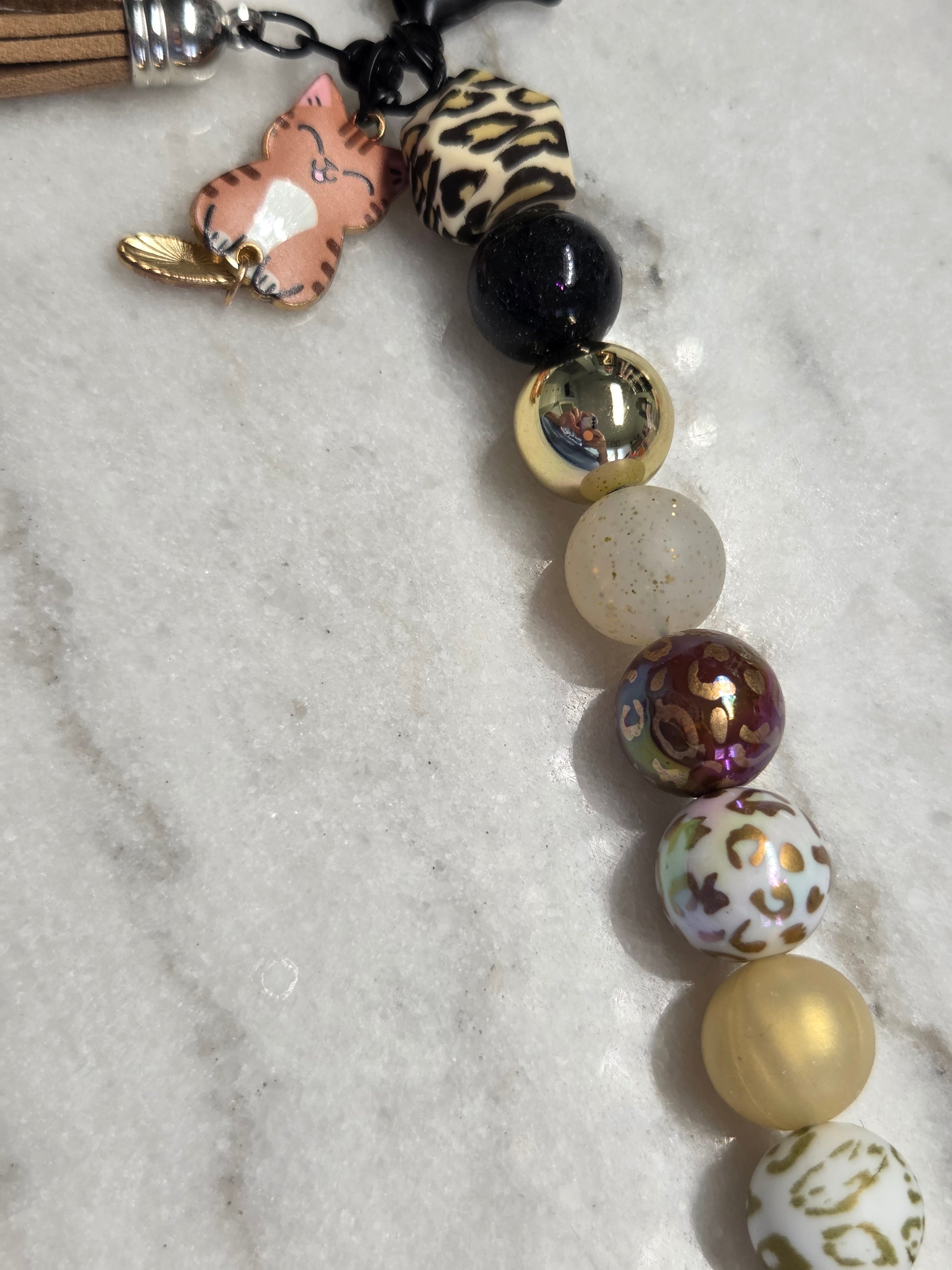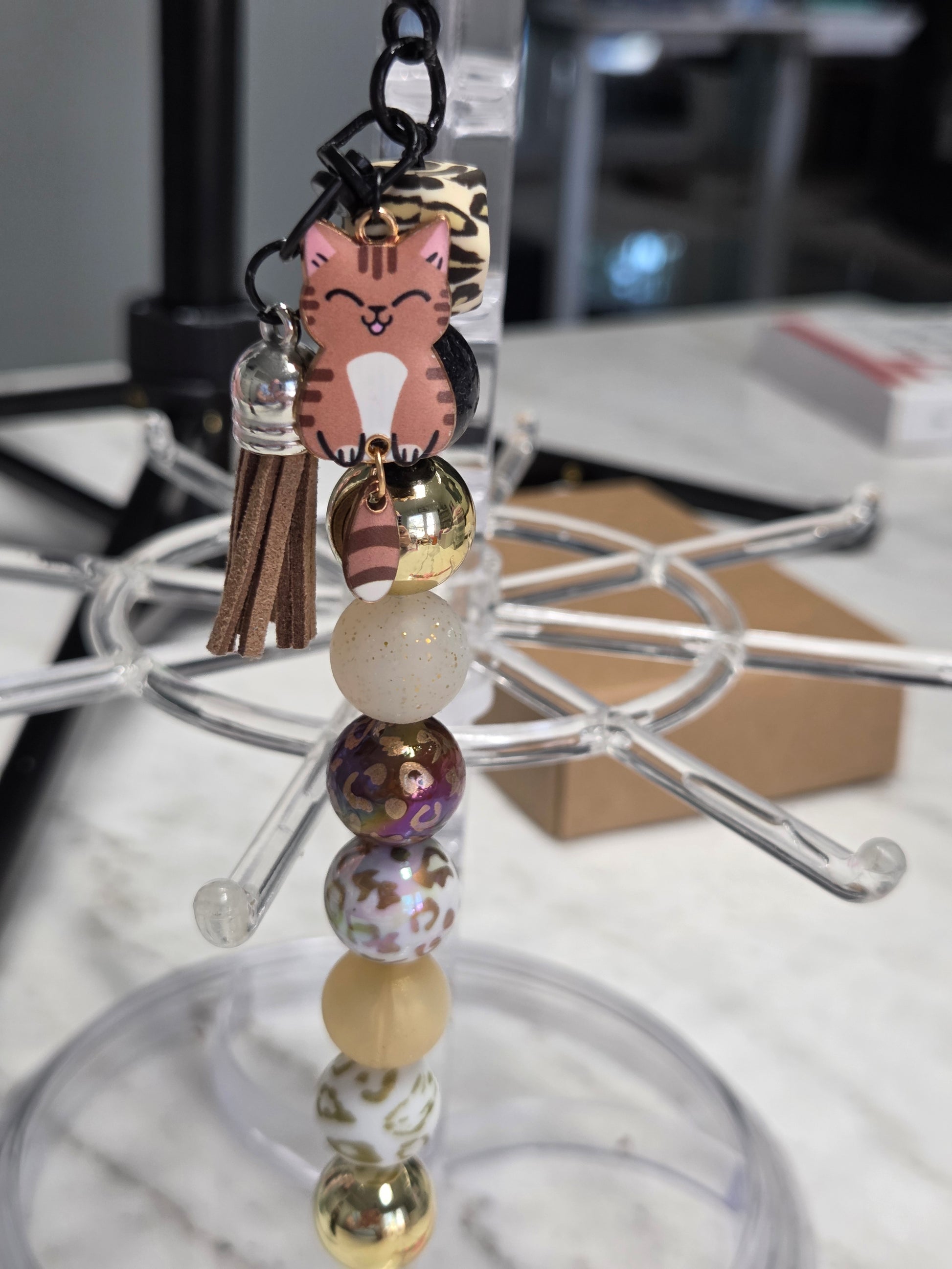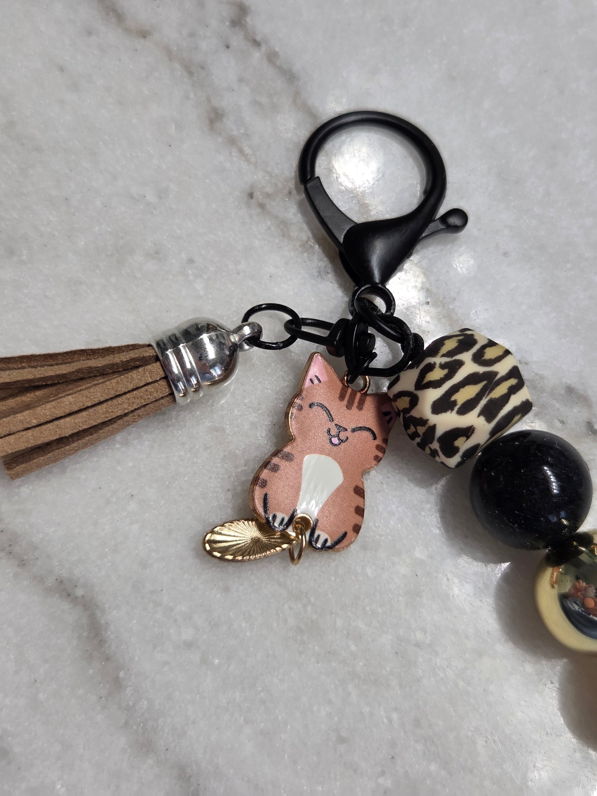 This keychain is part of a collection that my daughter aptly named "Whiskers & Paws." An exclusive club for cats and kitties and for all the people that love them! This keychain has a jungle theme with leopard print silicone and acrylic beads, featuring an adorable hanging brown cat focal. His tail moves back and forth as well. I think this would make a perfect keychain, but can also be used a bag charm, either works!