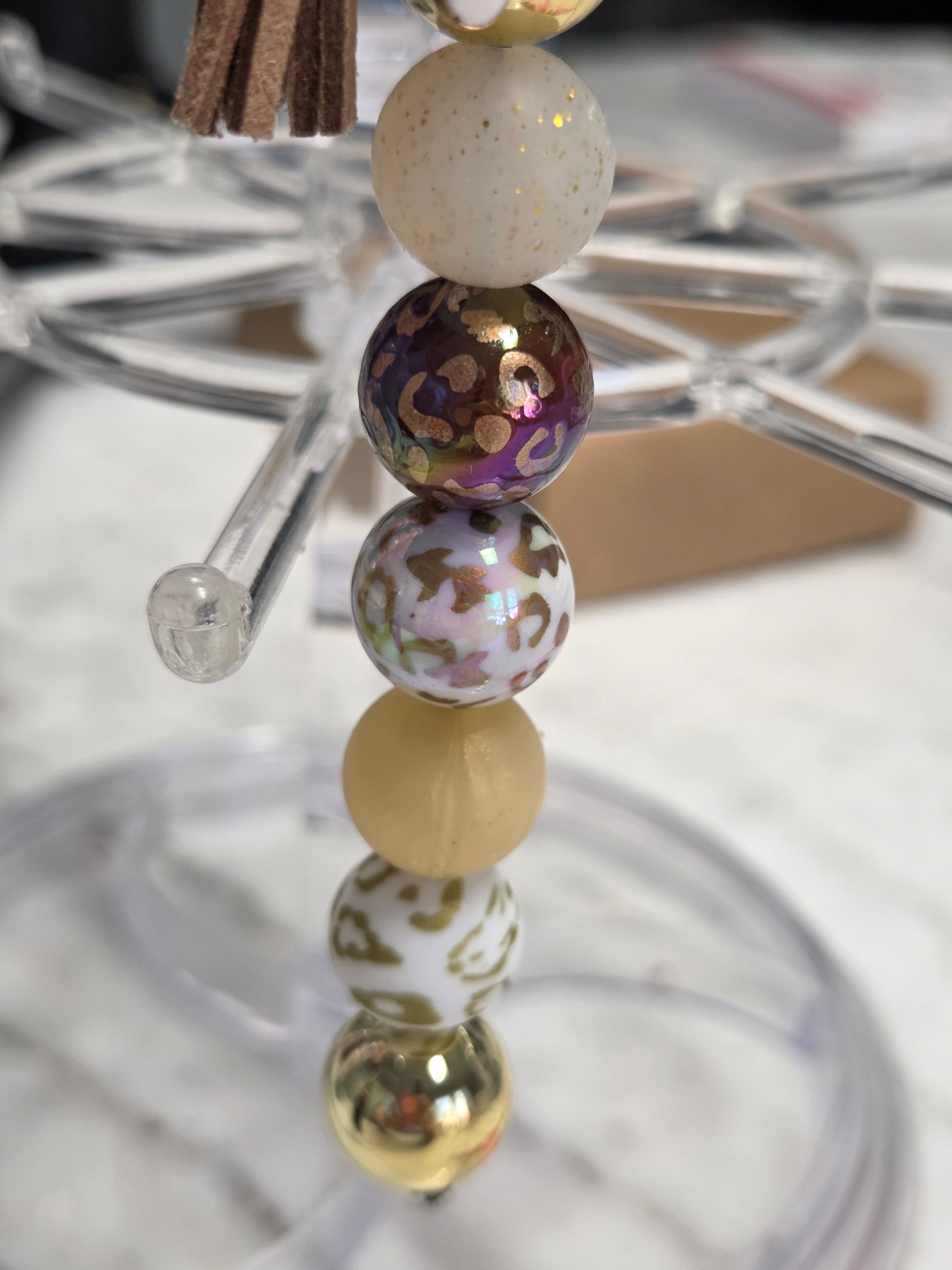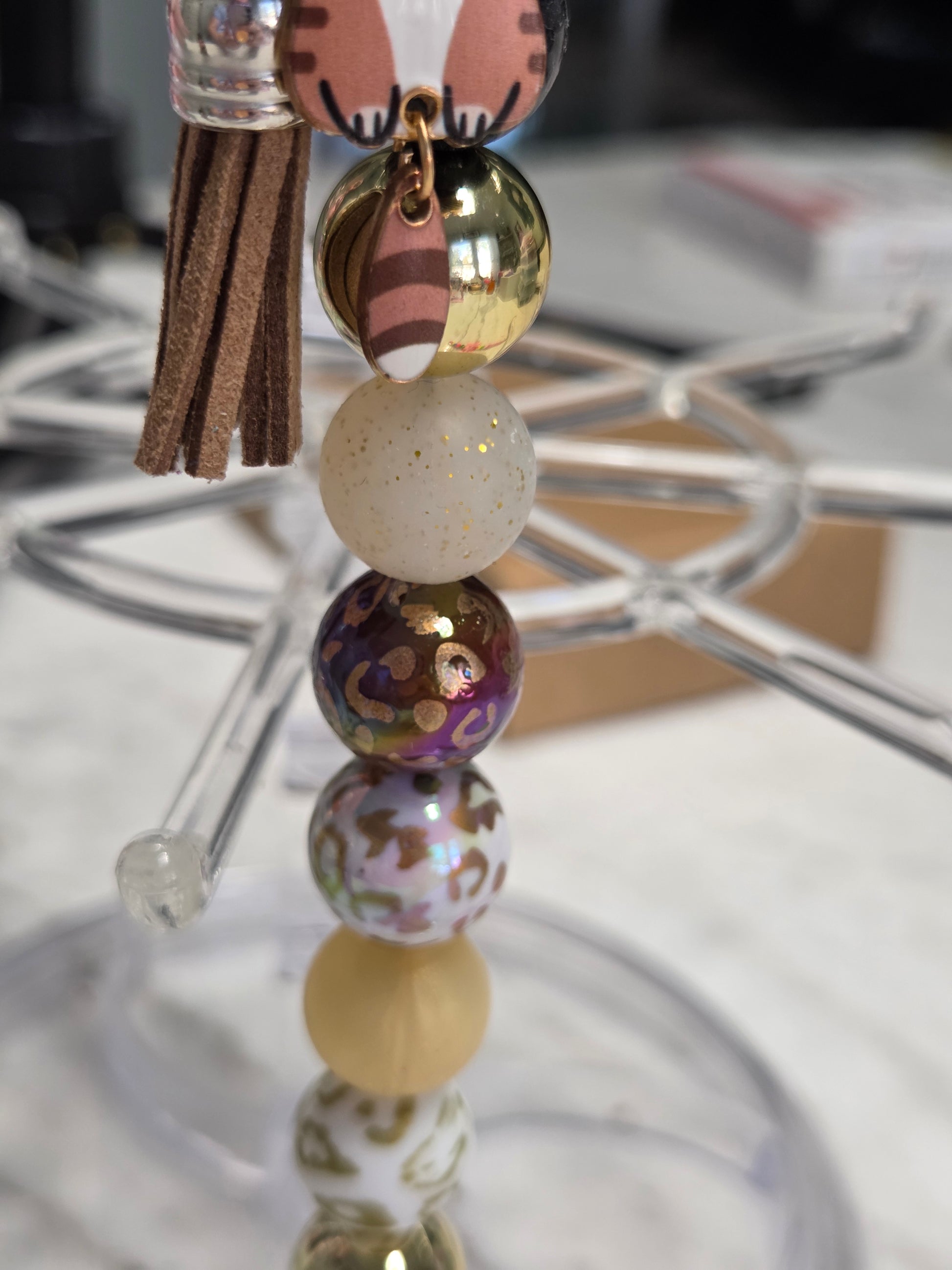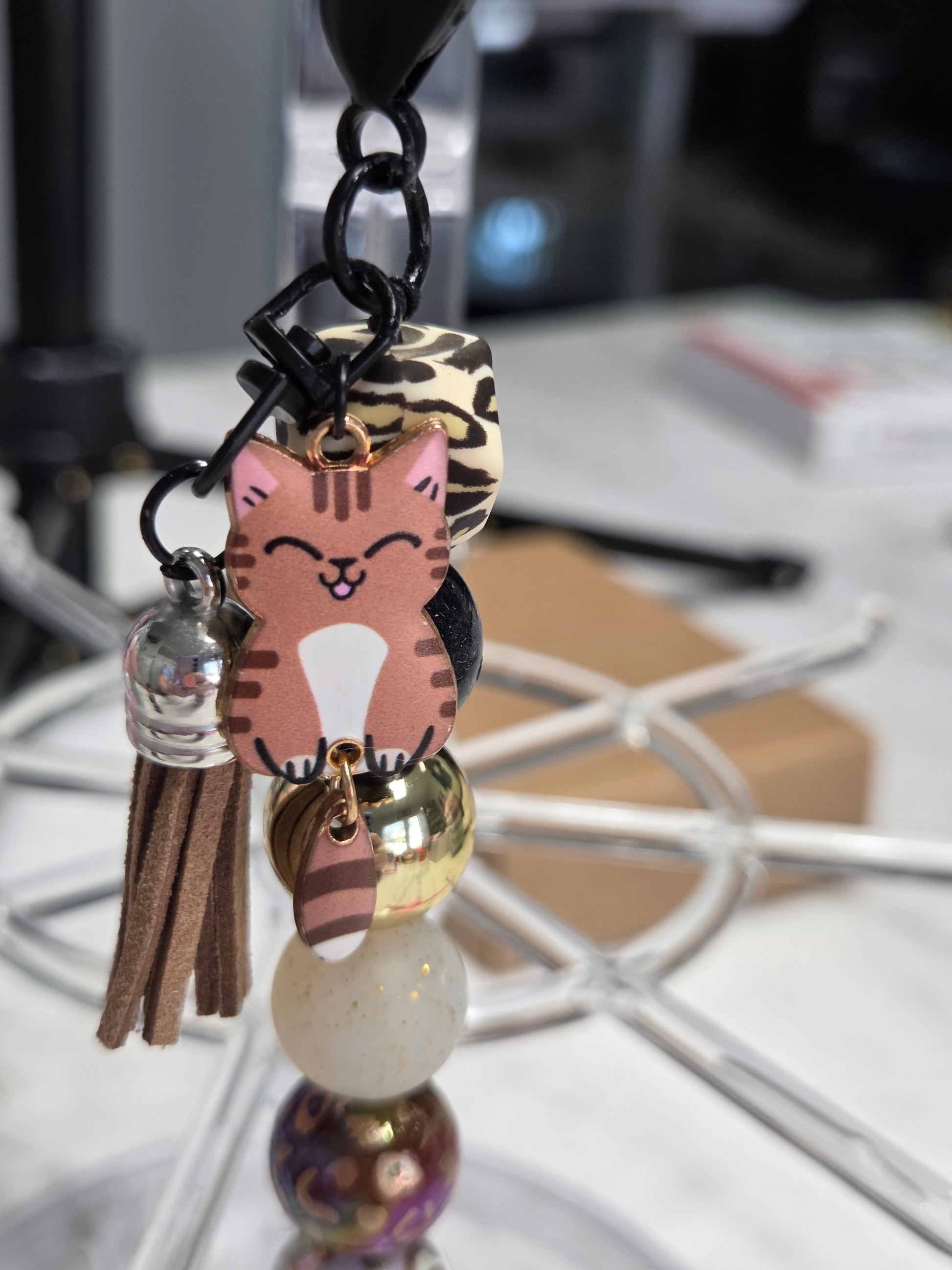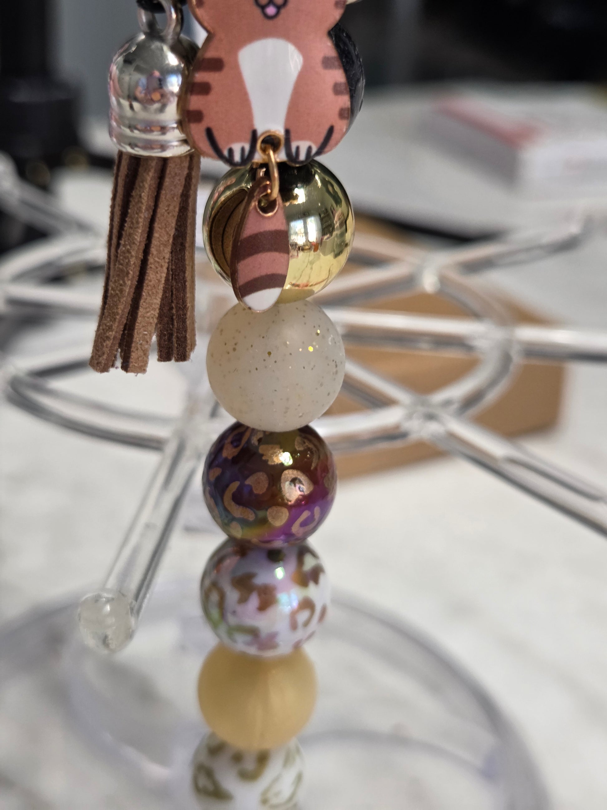 This keychain is part of a collection that my daughter aptly named "Whiskers & Paws." An exclusive club for cats and kitties and for all the people that love them! This keychain has a jungle theme with leopard print silicone and acrylic beads, featuring an adorable hanging brown cat focal. His tail moves back and forth as well. I think this would make a perfect keychain, but can also be used a bag charm, either works!